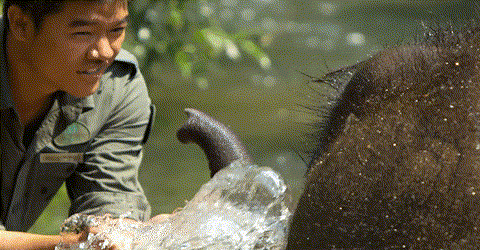 也可以揮動工具,當一回大象“鏟屎官”
