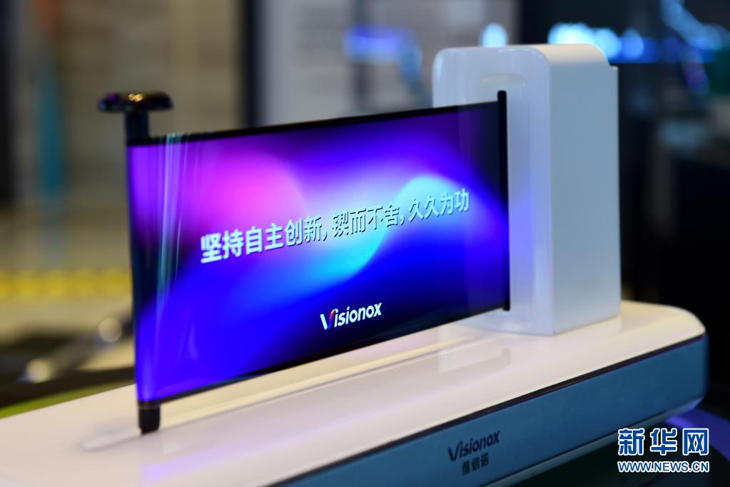 這是維信諾科技股份有限公司展出的可像紙張一樣彎曲折疊的柔性顯示屏(6月17日攝)。