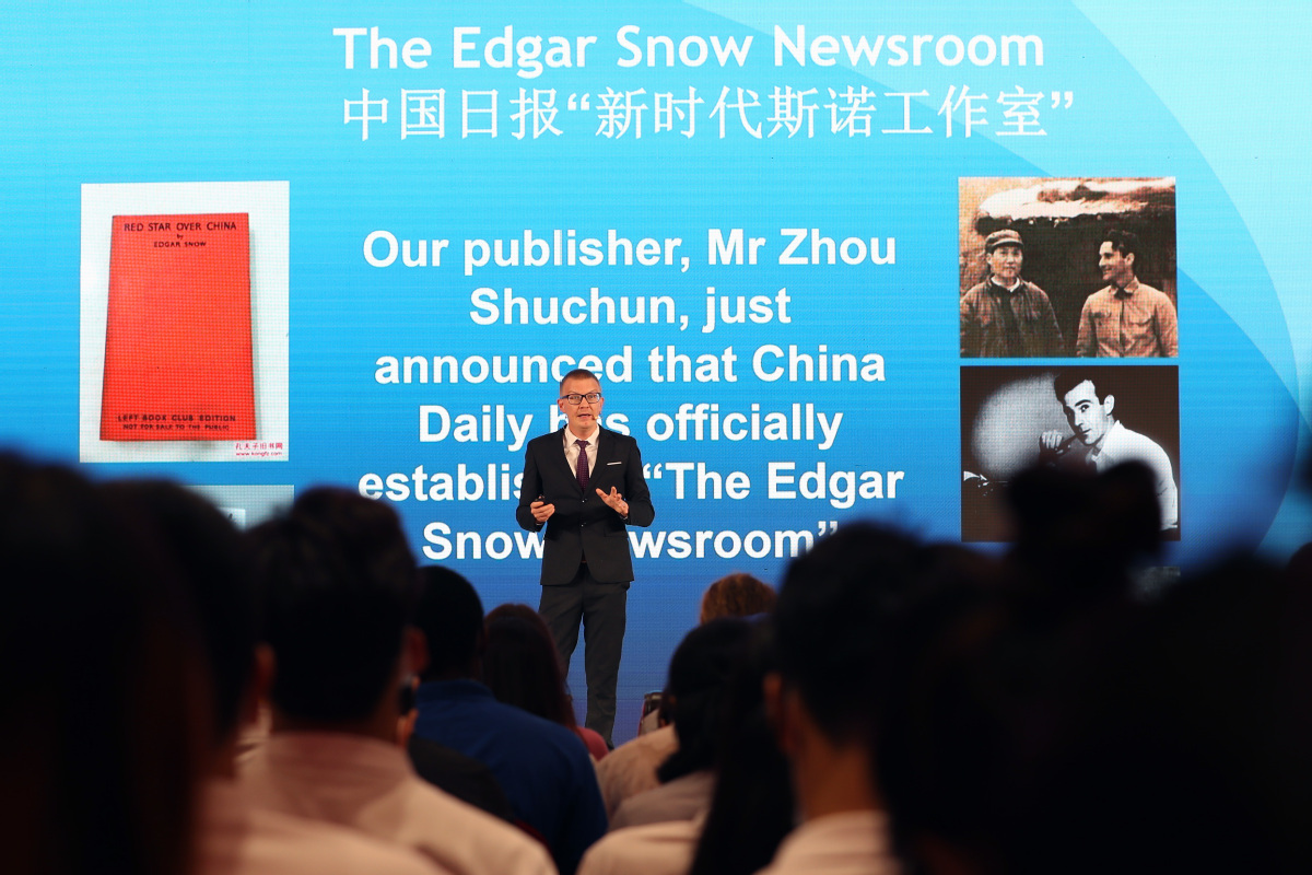 6月20日,為迎接和慶祝中國共產黨成立100周年,展示百年光輝歷程,傳播紅船精神,對外講好中國共產黨的故事,中國日報社聯合中共浙江省委宣傳部和中共嘉興市委于6月20日在嘉興南湖,共同舉辦主題為“從紅船走來:代表歷史前進方向的人民政黨”的“新時代大講堂”。活動期間,中國日報社還宣布成立“新時代斯諾工作室”。工作室將充分發揮報社資深外籍專家和國際友人的作用,對外講好中國故事和中國共產黨的故事,展示真實、立體、全面的中國。中國日報社資深外籍記者聶子瑞(Erik Nilsson)作為嘉賓發表了演講。