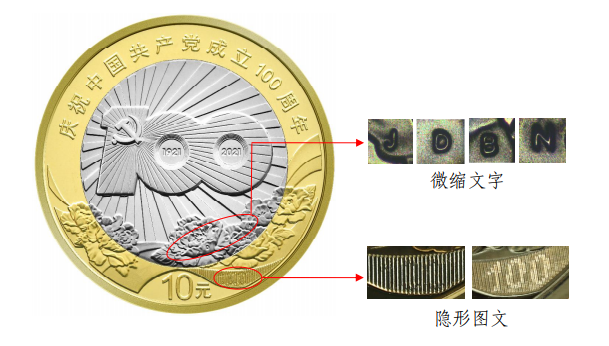 將硬幣傾斜適當角度,可在背面下方飄帶上,觀察到隱形圖文“100”。在硬幣背面的花瓣上,可觀察到微縮文字“J”“D”“B”“N”。