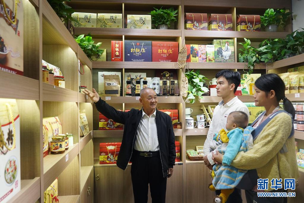 江西省贛州市于都縣梓山鎮潭頭村村民孫觀發(左一)向游客介紹當地的特色農產品(2020年10月21日攝)。新華社記者 萬象 攝