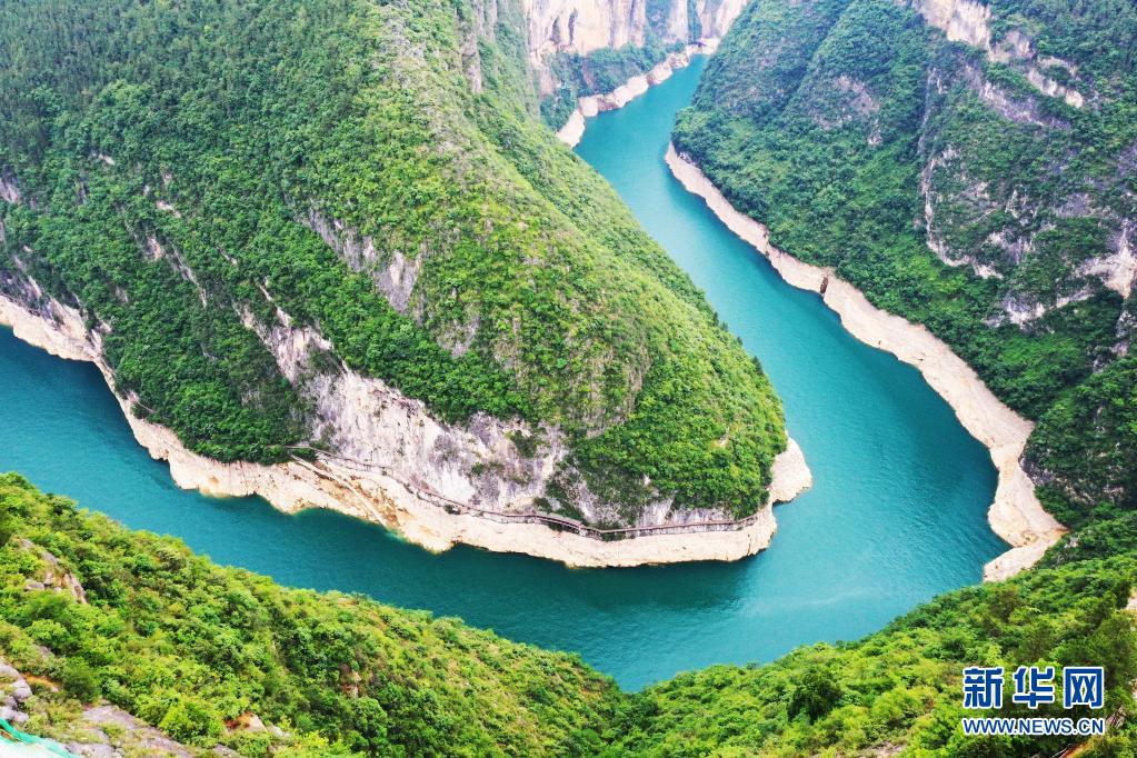 這是2020年5月26日拍攝的重慶市巫山縣魚頭灣景象(無人機照片)。長江經濟帶沿江11省市大力推進生態環境整治,“共抓大保護、不搞大開發”,共同舞動高質量發展的“綠色長龍”。新華社記者 王全超 攝