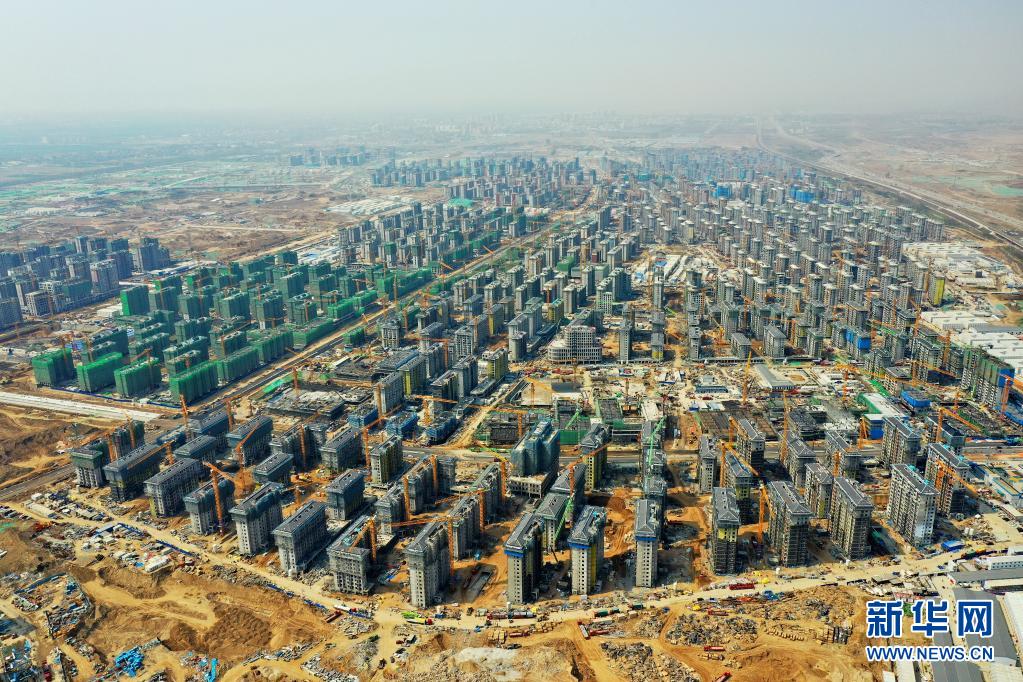 4月8日拍攝的河北雄安新區容東片區安置房項目建設現場(無人機照片)。新華社記者 牟宇 攝