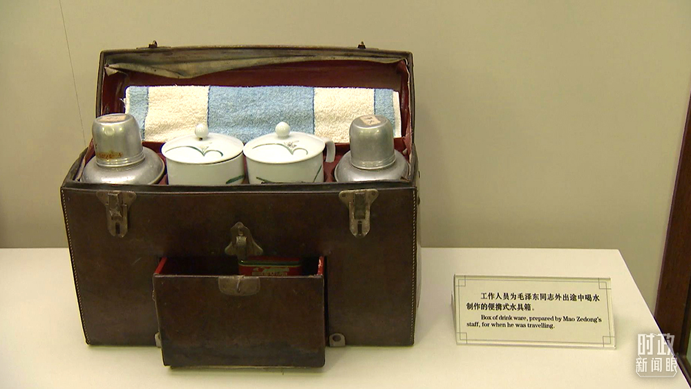 △這是工作人員為毛澤東外出途中喝水制作的便攜式水具箱,現(xiàn)陳列在豐澤園毛澤東同志故居。(總臺央視記者石偉明拍攝)