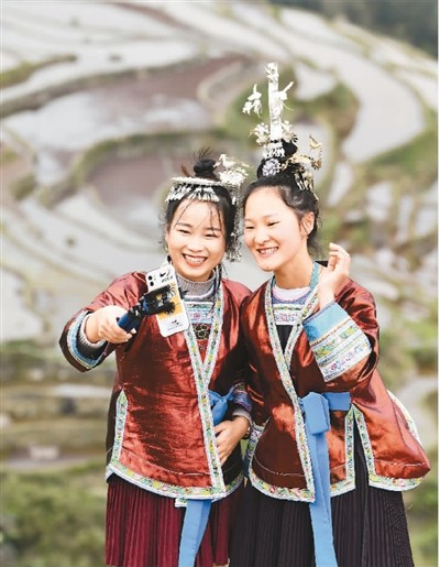 圖為貴州省從江縣加榜鄉加車村村民直播推介加榜梯田風光。
