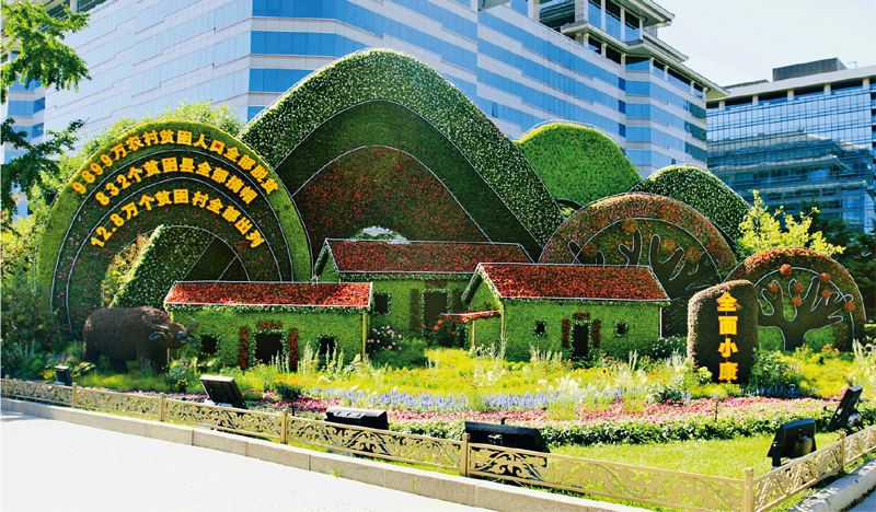 近日,在北京長安街沿線,10組獻禮中國共產黨成立100周年的立體花壇亮相,生動展示中國共產黨的奮斗歷程和偉大成就。圖為“全面小康”主題花壇。 人民視覺 方淑媛/攝