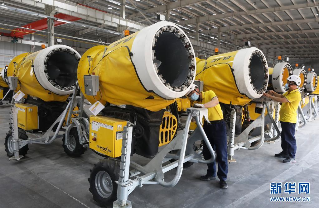 7月7日,在張家口高新區(qū)冰雪運(yùn)動(dòng)裝備產(chǎn)業(yè)園,一家冰雪設(shè)備生產(chǎn)公司工作人員在車間查驗(yàn)造雪機(jī)。