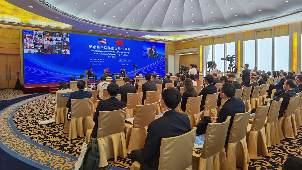 7月9日,紀念基辛格秘密訪華50周年活動在北京舉行,美國前國務卿基辛格通過視頻連線發表講話,呼吁中美兩國應該像50年前一樣,用對話和理解來解決分歧,兩國的對抗只會導致世界的分裂。中美代表等100余人現場參加活動,200多位美方各界人士通過視頻連線的方式參加活動。