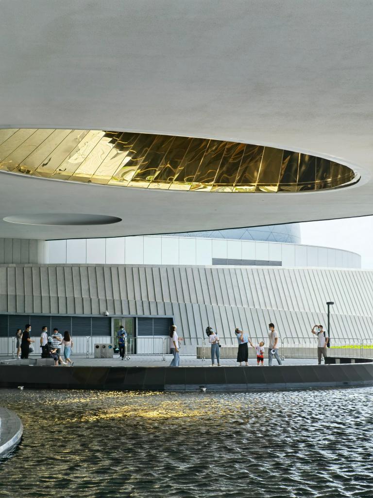 從空中俯瞰,整個天文館像一座表現(xiàn)時間流逝的大型天文儀器。主建筑以優(yōu)美的螺旋形態(tài)構(gòu)成“天體運行軌道”,獨具特色的圓洞天窗、球幕影院和倒轉(zhuǎn)穹頂這三個圓形元素構(gòu)成“三體”結(jié)構(gòu),共同詮釋天體運行的基本規(guī)律。其中,圓洞天窗位于主建筑的入口,當(dāng)太陽光穿過圓洞,會在地面形成光斑,隨著太陽在天空中移動,光斑也將在地面上緩緩移動,起到像日晷一樣的作用。