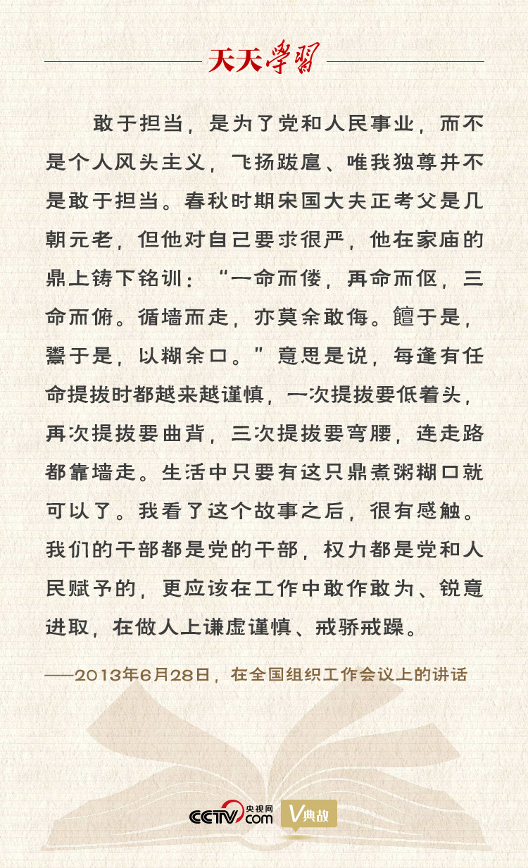 上面這條典故文字佶屈聱牙,習(xí)近平總書記在引用時(shí)進(jìn)行了生動(dòng)通俗的闡釋,告誡黨員領(lǐng)導(dǎo)干部要像正考父一樣嚴(yán)格要求自己,把位置放低,少些自滿,多些干勁。