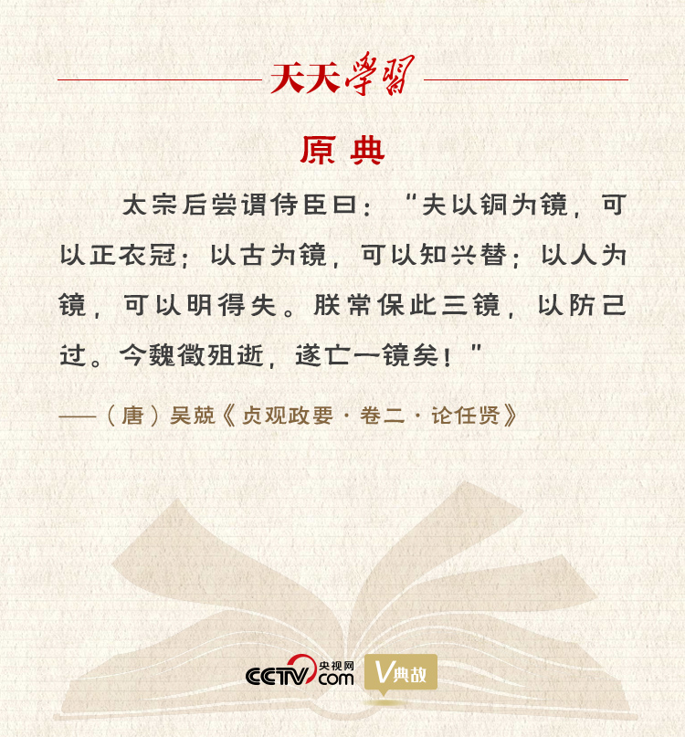 “以史為鑒,可以知興替”,最早應(yīng)出自唐代史學(xué)家吳兢的政論性史書(shū)《貞觀政要》:“夫以銅為鏡,可以正衣冠;以古為鏡,可以知興替;以人為鏡,可以明得失。”這是唐朝第一諍臣魏徵去世后,唐太宗對(duì)朝臣發(fā)出的感慨之言。《舊唐書(shū)·魏徵傳》抄錄此語(yǔ)。后來(lái),歐陽(yáng)修、宋祁所編《新唐書(shū)·魏徵傳》對(duì)此略作修改:“以銅為鑒,可正衣冠;以古為鑒,可知興替;以人為鑒,可明得失。”這句話的意思是,用銅作鏡子,可以端正衣冠;用歷史作鏡子,可以知道歷代興亡更替的規(guī)律;用人作鏡子,可以明了自身的得失。