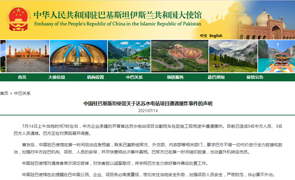 巴基斯坦發(fā)生爆炸致9名中方人員遇難 中國駐巴使館發(fā)布聲明