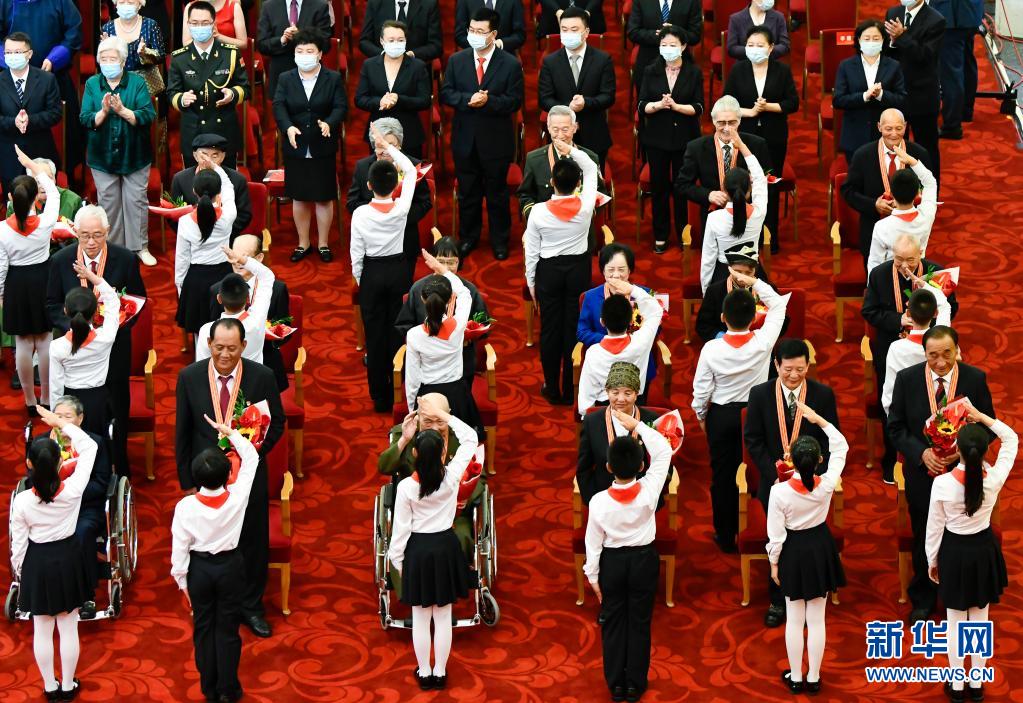 6月29日,慶祝中國共產黨成立100周年“七一勛章”頒授儀式在北京人民大會堂金色大廳隆重舉行。這是少先隊員向勛章獲得者獻花,敬禮致意。新華社記者 高潔 攝