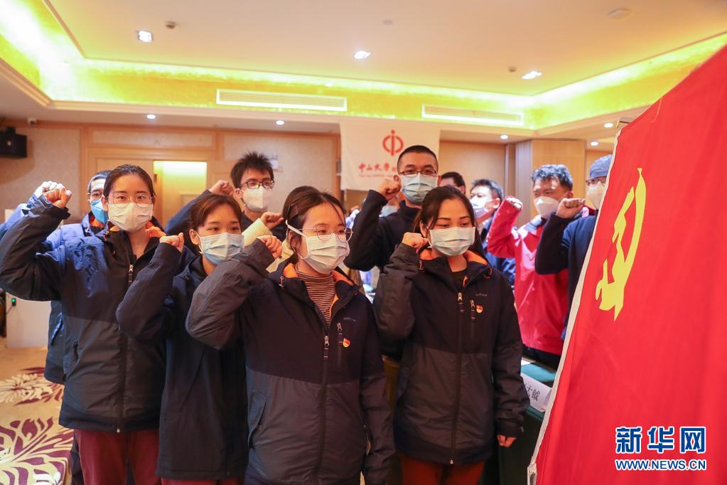 廣州中山大學附屬第一醫院馳援武漢醫療隊火線入黨的新黨員在武漢漢口醫院宣誓(2020年3月2日攝)。新華社發