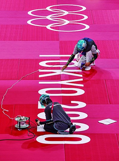 7月21日,日本武道館內的奧運會工作人員在柔道比賽臺墊上張貼奧運標識。新華社發