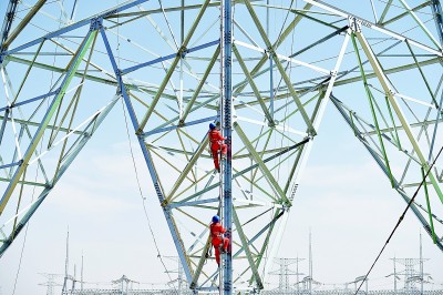 國網青海省電力檢修公司專業人員在青豫特高壓直流輸電線作業。新華社發