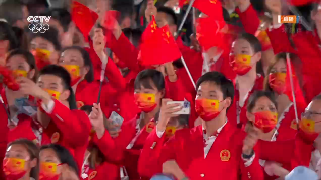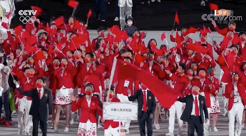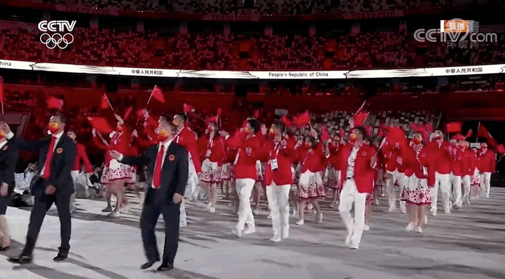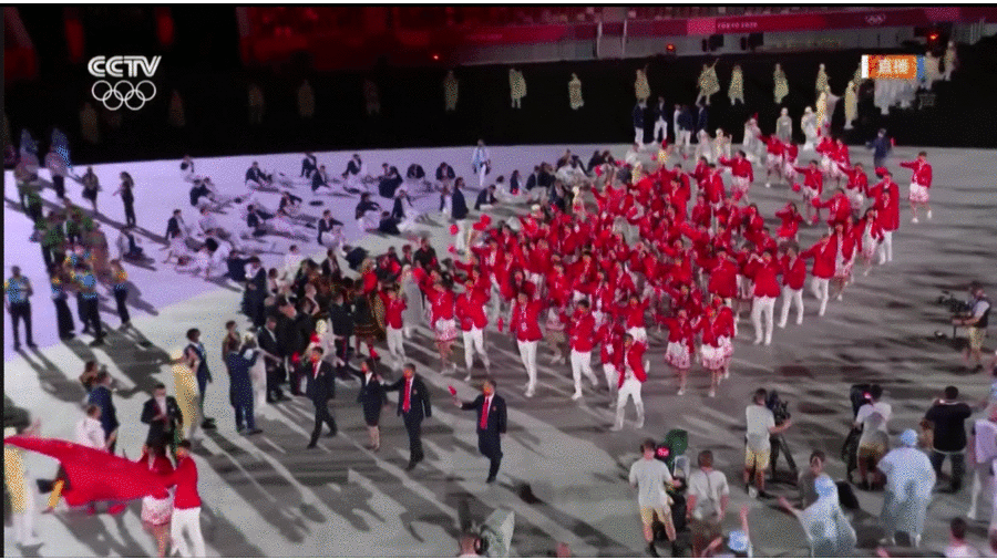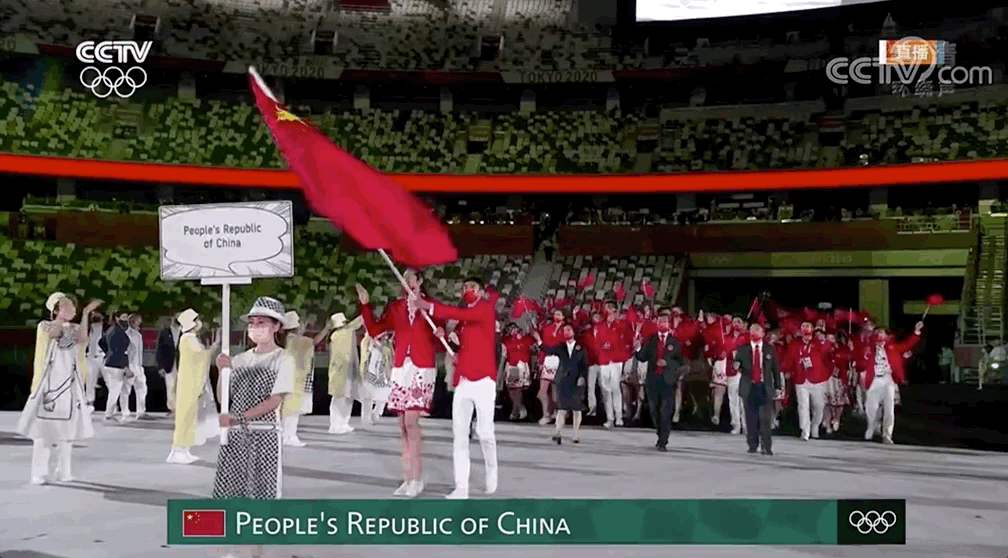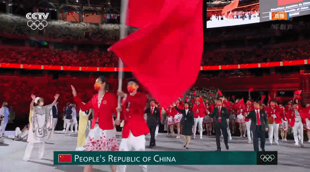 女排運動員朱婷、跆拳道運動員趙帥高擎五星紅旗,中國體育代表團步入東京奧林匹克體育場。