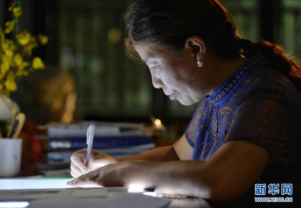 道安在設(shè)計(jì)銀花絲擺件的圖稿(7月15日攝)。