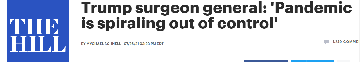 據(jù)美國(guó)《國(guó)會(huì)山報(bào)》當(dāng)?shù)貢r(shí)間7月26日?qǐng)?bào)道,美國(guó)前衛(wèi)生局局長(zhǎng)杰羅姆·亞當(dāng)斯在接受哥倫比亞廣播公司采訪時(shí)表示,隨著美國(guó)新冠肺炎確診病例的激增和疫苗接種率陷于停滯,美國(guó)新冠肺炎疫情再次處于“失控”狀態(tài)。