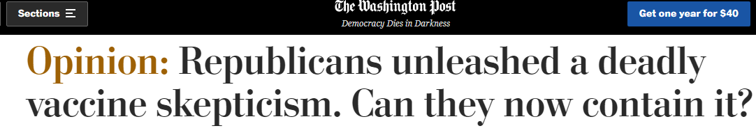 7月25日,《華盛頓郵報(bào)》刊登專欄作家、美國(guó)喬治敦大學(xué)教授小尤金·約瑟夫·迪昂撰寫的題為《共和黨人制造了致命的疫苗懷疑論,現(xiàn)在他們還能遏制懷疑論嗎?》的文章。