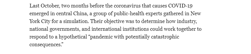 除了出現(xiàn)的早期病例,最近人們的目光還聚焦在了2019年美國(guó)舉行的一場(chǎng)流行病演習(xí)上。美國(guó)《紐約雜志》報(bào)道稱,那一年的10月,美國(guó)舉行了一場(chǎng)代號(hào)為“事件201”的全球流行病大演習(xí),模擬一種冠狀病毒在全球范圍內(nèi)傳播。