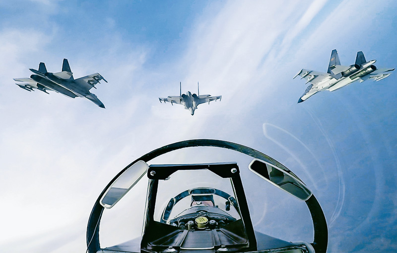 搏擊長空心向黨。圖為北部戰(zhàn)區(qū)空軍航空兵某旅飛行員在訓練中組成四機編隊,撲向地面目標展開進攻作戰(zhàn)。 新華社發(fā) 楊盼/攝