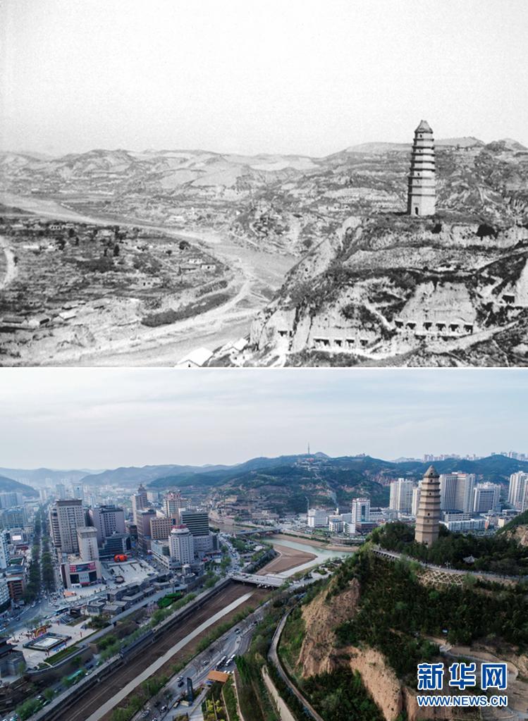 拼版照片:上圖是1938年拍攝的延安(資料照片),下圖是2021年4月22日拍攝的延安市(無人機照片,新華社記者張博文攝)。