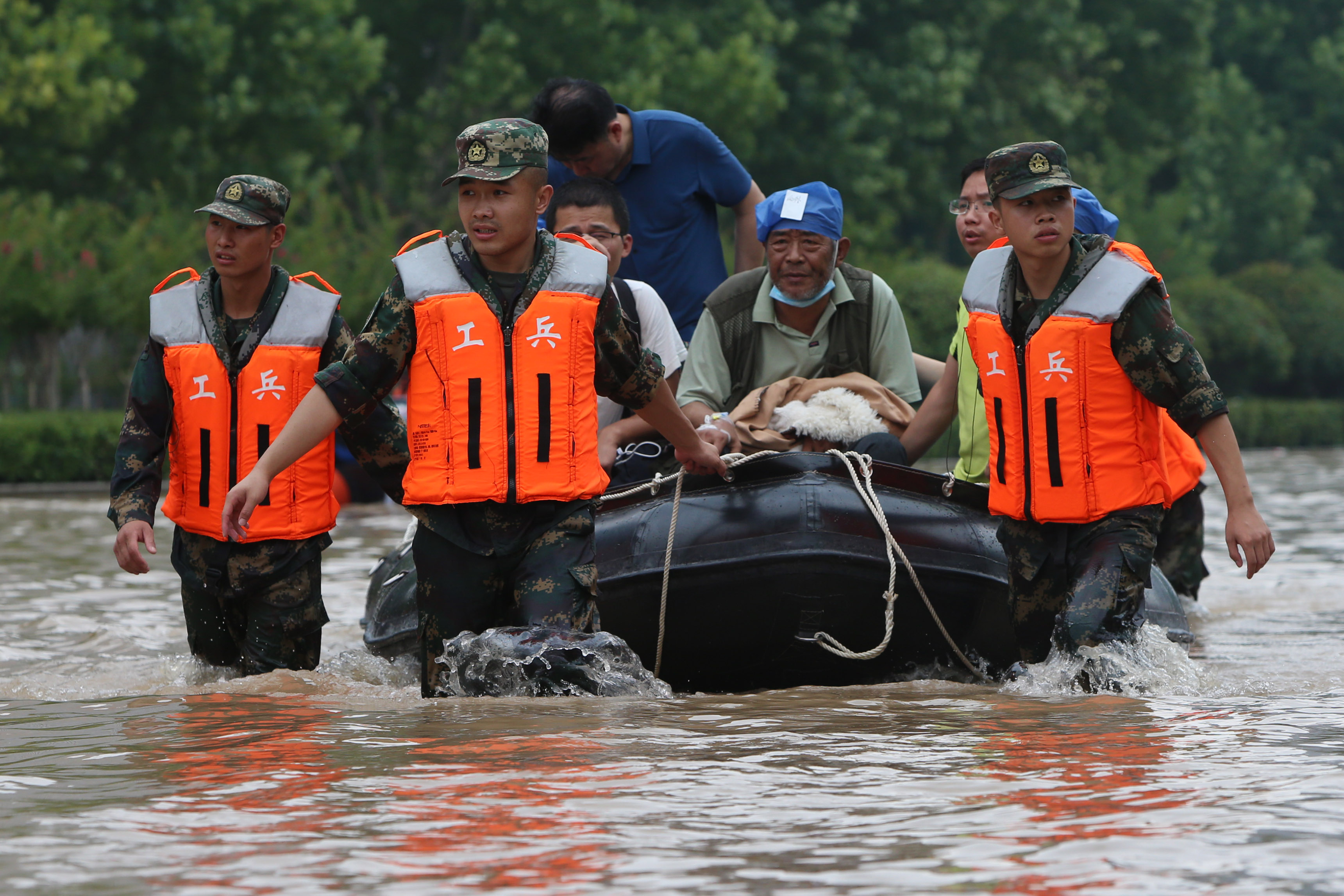 7月22日,在鄭州阜外華中心血管病醫院附近,救援人員轉移病患。