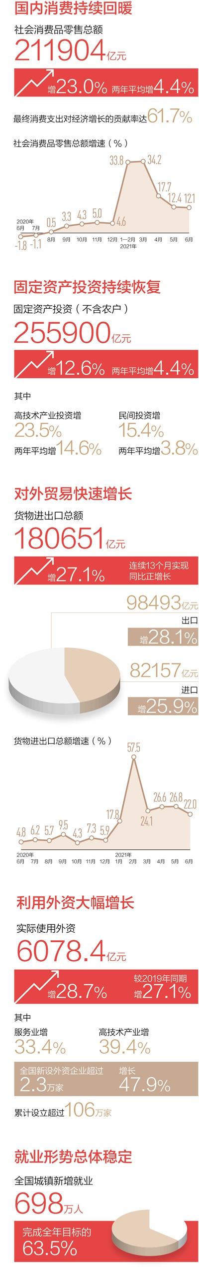 經濟持續穩定增長。初步核算,上半年國內生產總值同比增長12.7%,高于6%以上的年度預期目標。其中,二季度同比增長7.9%,兩年平均增長5.5%,比一季度加快0.5個百分點。