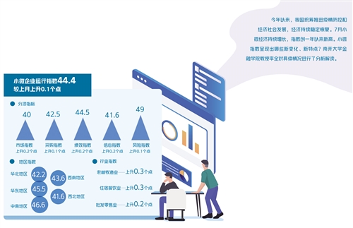 7月份,“經濟日報-中國郵政儲蓄銀行小微企業運行指數”為44.4,較上月上升0.1個點。分項指數呈現“五升三平”態勢。其中市場指數為40,上升0.2個點;采購指數為42.5,上升0.1個點;績效指數為44.5,上升0.2個點;擴張指數為42.6,與上月持平;信心指數為41.6,上升0.2個點;融資指數為52.9,與上月持平;風險指數為49,上升0.1個點;成本指數為63,與上月持平。自2020年7月以來,小微企業運行指數穩中有升。