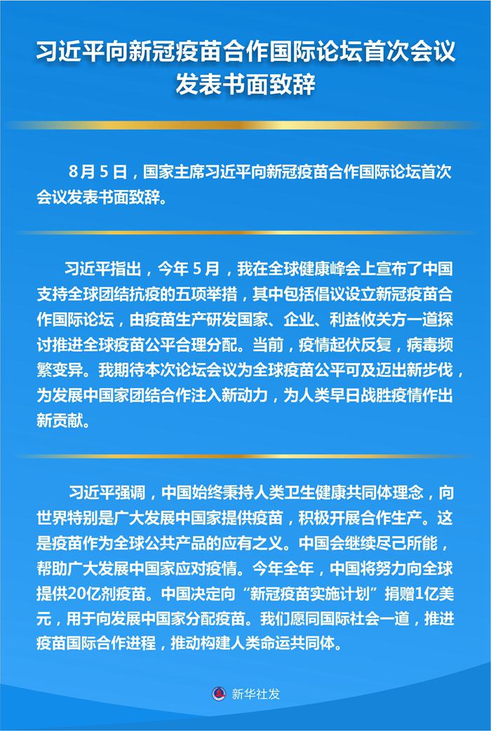 “今年5月,我在全球健康峰會上宣布了中國支持全球團結(jié)抗疫的五項舉措,其中包括倡議設(shè)立新冠疫苗合作國際論壇,由疫苗生產(chǎn)研發(fā)國家、企業(yè)、利益攸關(guān)方一道探討推進全球疫苗公平合理分配。”習(xí)近平在書面致辭中介紹了本次論壇的由來。