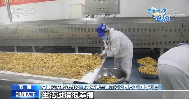 易地扶貧搬遷群眾 洛宗特色產品開發公司員工 四郎扎巴:我這個車間主要負責洗青稞、青稞剝皮,我妻子在泡菜車間工作,她每月2400元,我們倆加起來一年也有6萬多(元)收入,以前一年收入不到1萬(元),搬過來以后在這邊實現就業,收入各方面都很穩定,生活過得很幸福。
