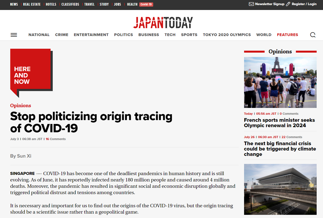 近日,日媒《今日日本》刊發新加坡獨立評論作家孫喜的評論文章,批評美國將新冠病毒溯源問題政治化。