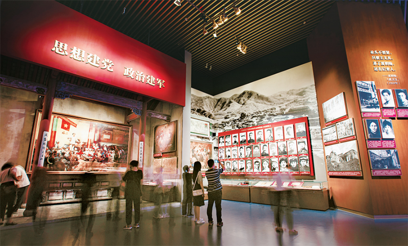 1929年12月,中共紅四軍第九次代表大會在福建上杭古田召開,古田會議確立了思想建黨、政治建軍的根本原則。圖為2021年7月19日,在參觀中國共產黨歷史展覽館舉行的“‘不忘初心、牢記使命’中國共產黨歷史展覽”時,觀眾在油畫《古田會議》前駐足。 劉新武/攝