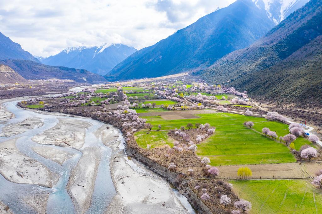 西藏林芝市波密縣境內(nèi)桃花盛開(kāi)的田園風(fēng)光(2020年3月26日攝,無(wú)人機(jī)照片)。新華社記者普布扎西 攝
