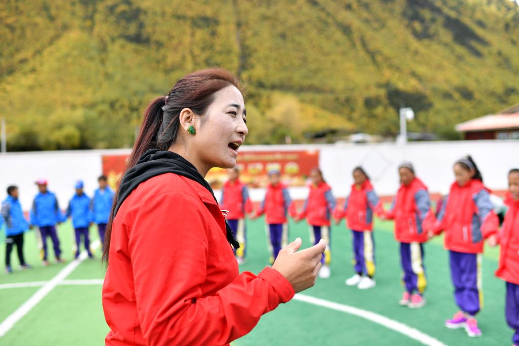 在西藏林芝市波密縣多吉鄉(xiāng)中心小學(xué),央宗給學(xué)生們傳授“波央”的發(fā)音技巧(2020年10月13日攝)。新華社記者詹彥 攝