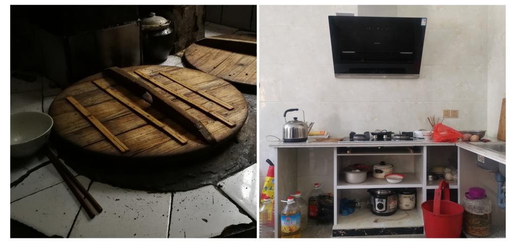 拼版照片:左圖為2017年8月29日,記者在一戶(hù)農(nóng)家中拍攝的土灶臺(tái)。