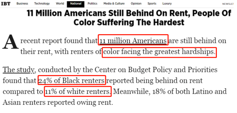 △《國際財經時報》(IBT)網站:近期報告顯示,美國仍有1100多萬成年人無力按時繳納房租,少數族裔面臨的困難尤甚,有24%的黑人租戶拖欠租金,而白人租戶拖欠租金的比例僅為11%。