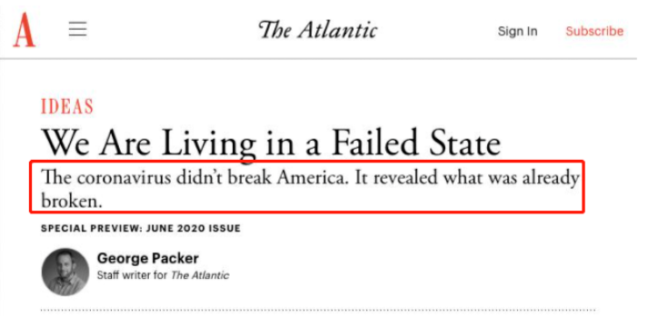 正如《大西洋月刊》早前刊文指出的那樣,“我們生活在一個失敗的國家”,“新冠病毒沒有撕裂美國,只是暴露了美國已有的撕裂”。