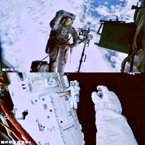 這其中,最受矚目的莫過于兩名航天員的“太空互拍”:聶海勝站在核心艙機械臂上,面向鏡頭揮手致意,身后是蔚藍的地球家園,兩者幾乎融為一體;劉伯明則幾乎是“掛”在空間站上,雙腿前伸。兩人身著我國自主研制的新一代“飛天”艙外航天服,在太空中格外醒目。