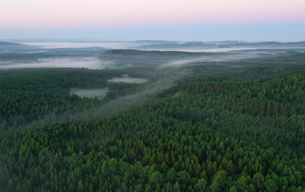 ↑塞罕壩國家森林公園晨景(2021年6月27日攝,無人機照片)。