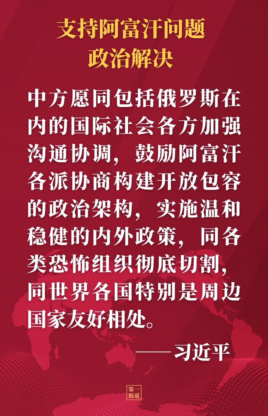 習近平強調,中方尊重阿富汗的主權、獨立、領土完整,奉行不干涉阿內政的政策,一直為政治解決阿富汗問題發揮建設性作用。中方愿同包括俄羅斯在內的國際社會各方加強溝通協調,鼓勵阿富汗各派協商構建開放包容的政治架構,實施溫和穩健的內外政策,同各類恐怖組織徹底切割,同世界各國特別是周邊國家友好相處。