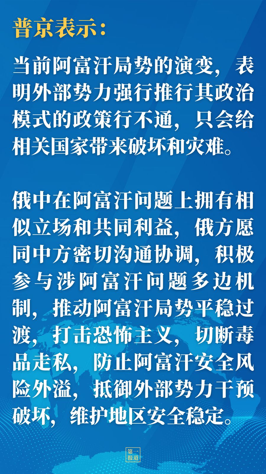 普京表示,當前阿富汗局勢的演變,表明外部勢力強行推行其政治模式的政策行不通,只會給相關國家帶來破壞和災難。俄中在阿富汗問題上擁有相似立場和共同利益,俄方愿同中方密切溝通協調,積極參與涉阿富汗問題多邊機制,推動阿富汗局勢平穩過渡,打擊恐怖主義,切斷毒品走私,防止阿富汗安全風險外溢,抵御外部勢力干預破壞,維護地區安全穩定。