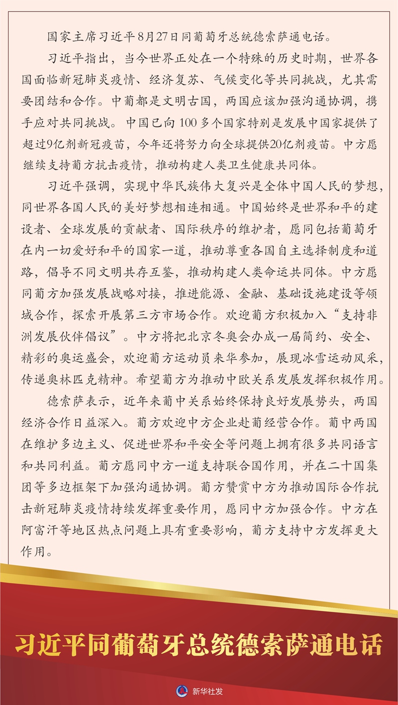 新華社北京8月27日電 國(guó)家主席習(xí)近平8月27日同葡萄牙總統(tǒng)德索薩通電話(huà)。