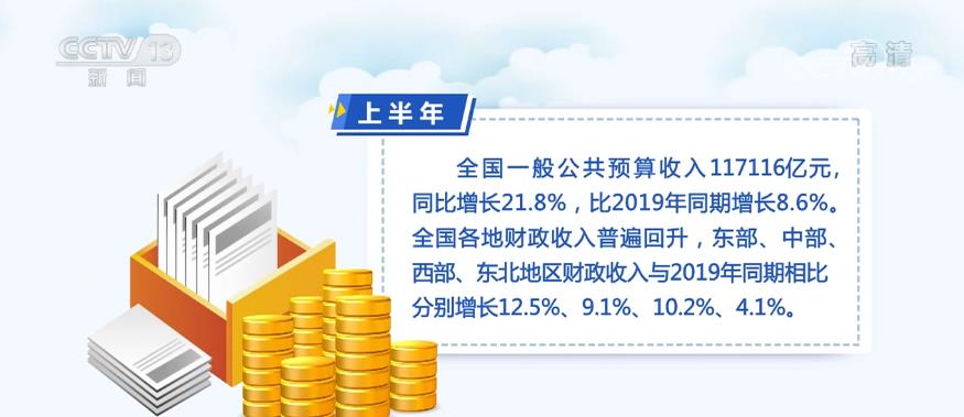 根據報告,上半年,全國一般公共預算收入117116億元,同比增長21.8%,比2019年同期增長8.6%。全國各地財政收入普遍回升,東部、中部、西部、東北地區財政收入與2019年同期相比分別增長12.5%、9.1%、10.2%、4.1%。