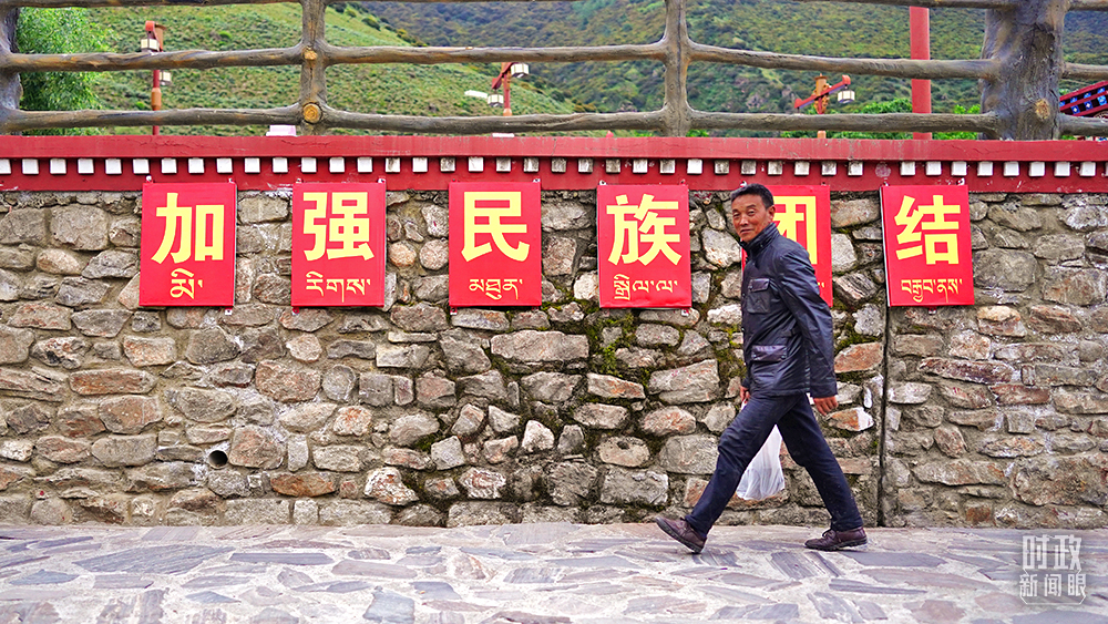 △西藏林芝嘎拉村村民走過“加強民族團結”標語墻。(總臺國廣記者李晉拍攝)