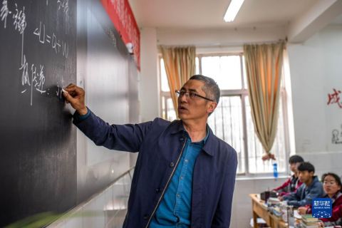 寧蒗寧海民族中學海安4班的班主任謝友軍在教室里上課(4月16日攝)。新華社記者 胡超 攝