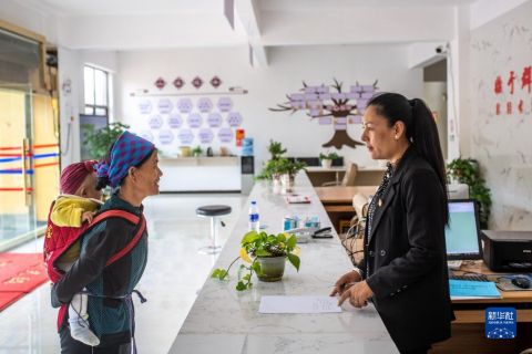 在寧蒗縣幸福家園易地扶貧搬遷安置區,搬遷戶蘇解放莫向紫瑪街道黨工委副書記盧云花(右)咨詢就業補助事項(8月25日攝)。新華社記者 胡超 攝