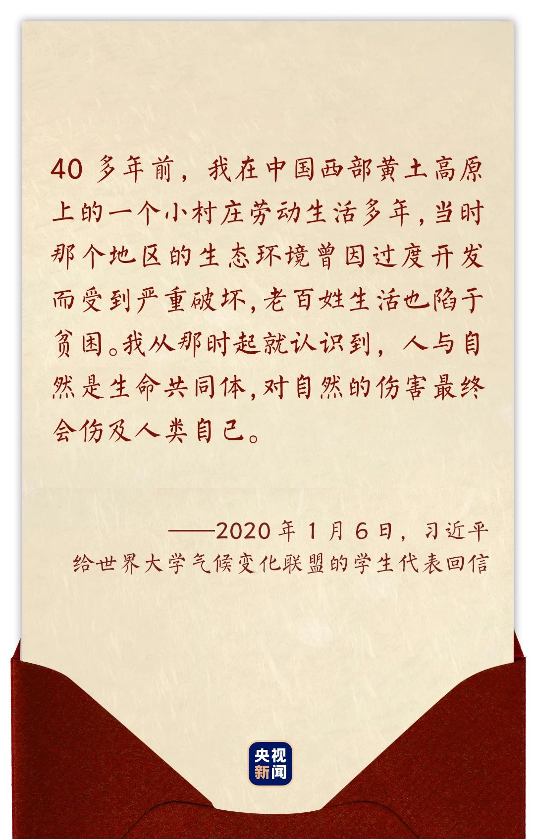2020年1月6日,習近平在給世界大學氣候變化聯盟的學生代表回信時,這樣回憶道——