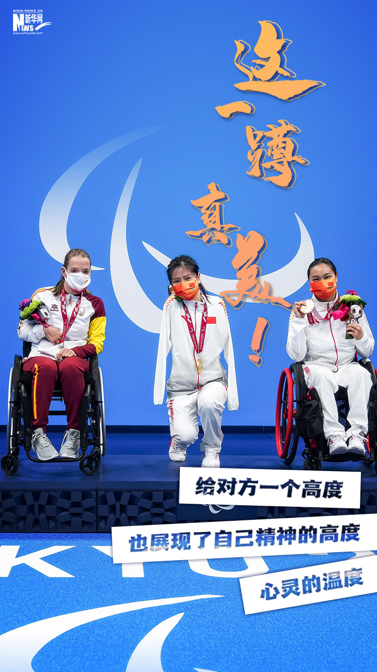 在領獎臺上,由于其他兩位獲獎者坐在輪椅上,盧冬單腿下蹲與她們合影,三位運動員留下了本屆殘奧會上最美照片之一。